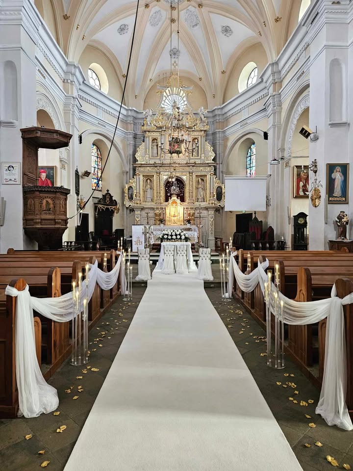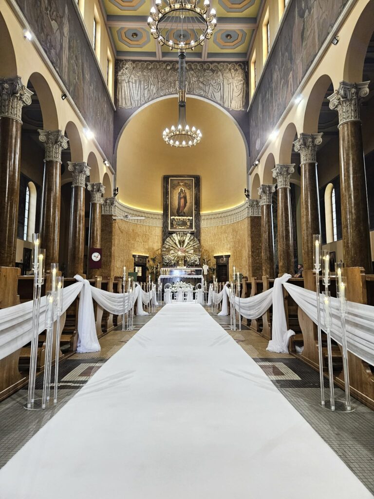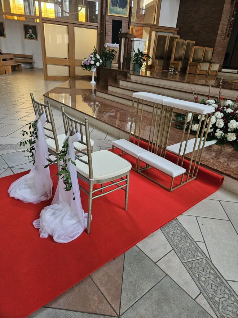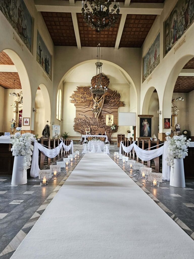 Nieodłącznym i bardzo istotnym elementem dekoracji kościoła na ślub jest dywan. Jest to ten element dekoracji który gra pierwsze skrzypce po wejściu do kościoła. Pozwala wręcz odmienić wnętrze, podkreśla rangę uroczystości zaślubin, pomaga wyeksponować suknię czy welon panny młodej.