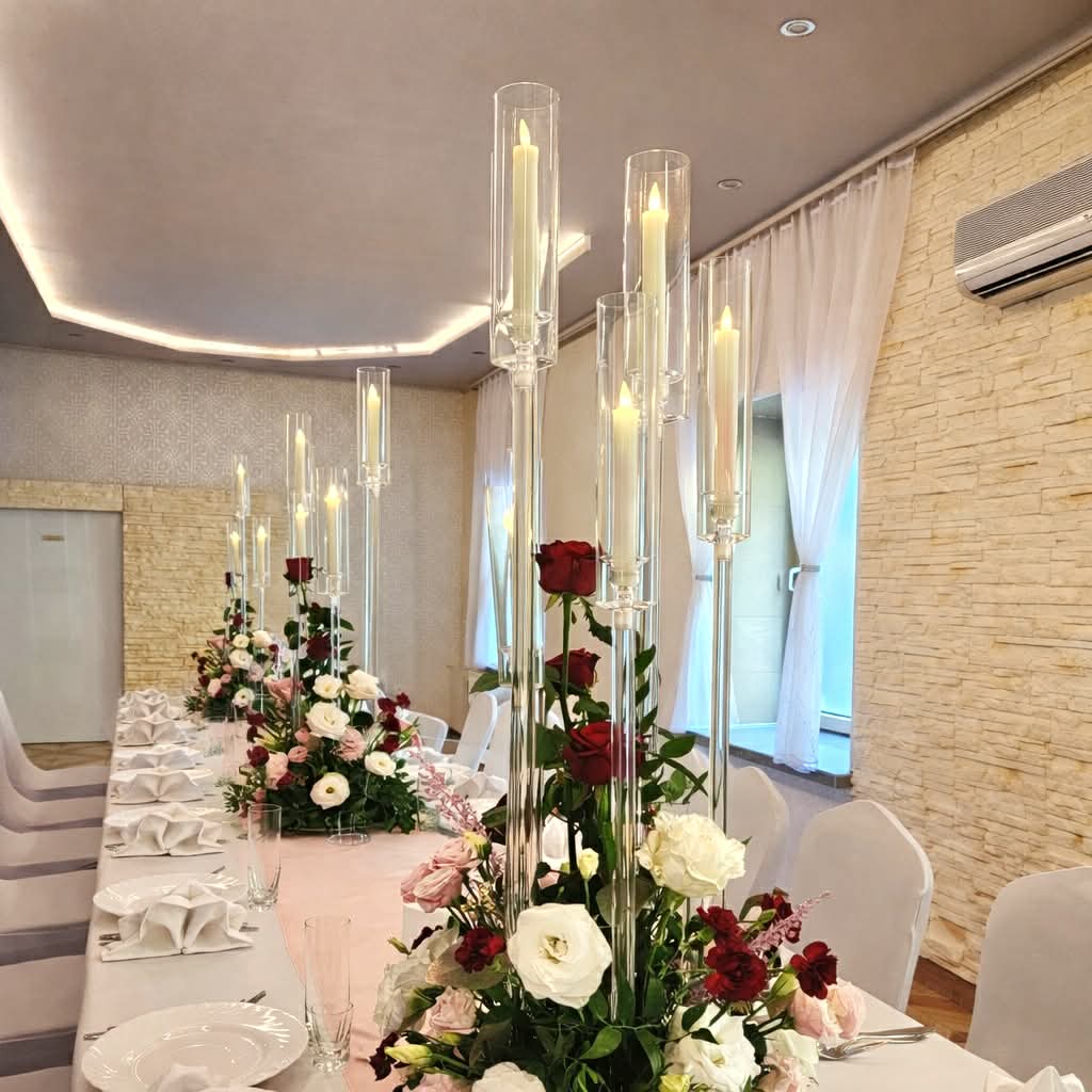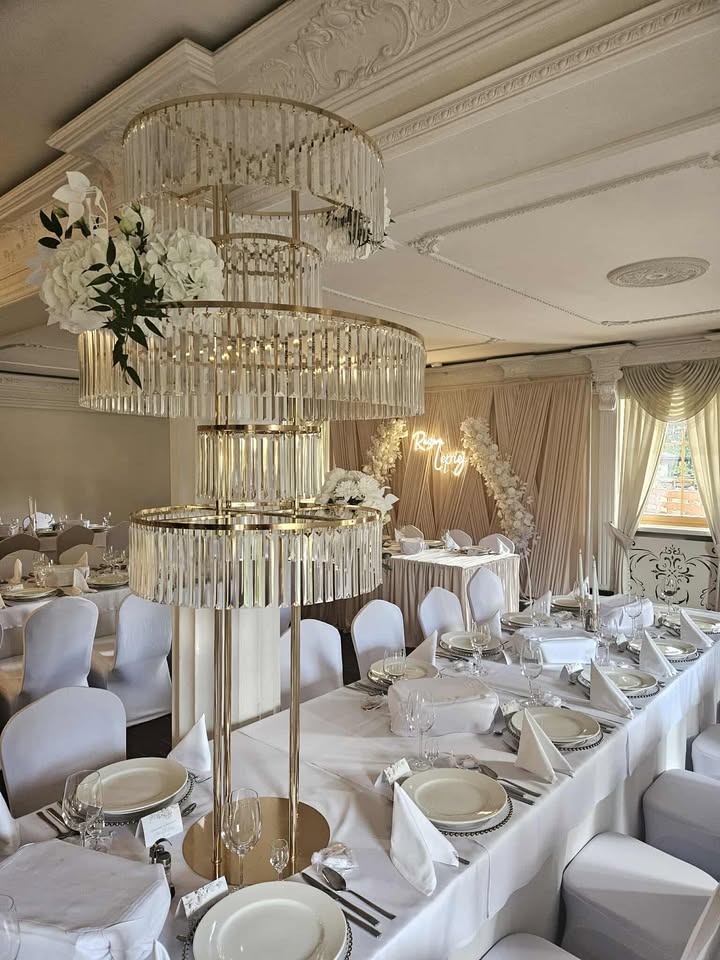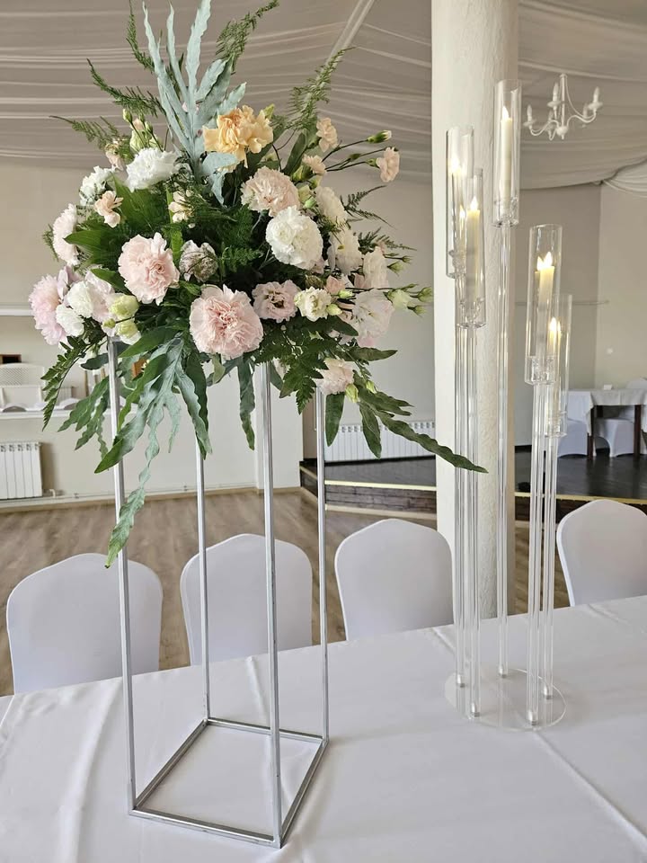 Do dekoracji ślubnych wykorzystujemy kwiaty, świece, tkaniny, obrusy, serwetki, pod talerze, ścianki do zdjęć, tablice powitalne, oświetlenie dekoracyjne, efektowne świeczniki czy podstawy pod kompozycje kwiatowe.