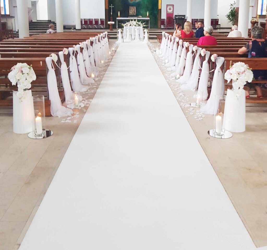 Biały dywan na ślub, gruby,, ciężki, podgumowany dywan o szerokości 1,5 m wynajmujemy na terenie Łodzi i okolic z naszym transportem, w cenie rozwinięcie i zwinięcie po uroczystości. Kilka długości do wyboru. Szerokość 150 cm jest niezwykle efektowna.