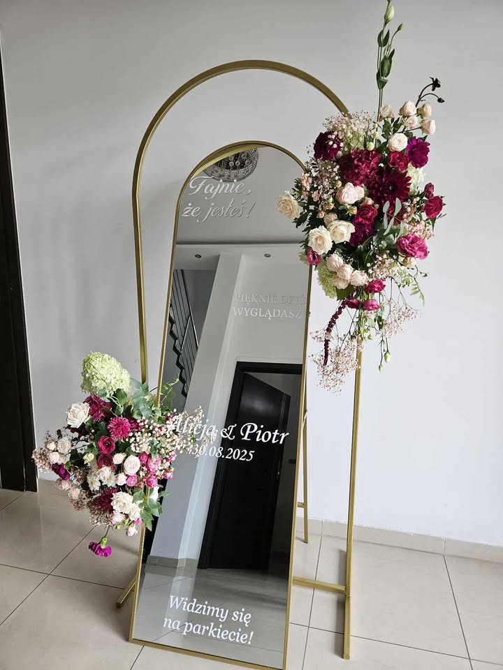 Lustro do selfie, absolutny must have na weselu! Idealne jako powitanie i pamiątkowe tło, personalizowane, w pięknej złotej ramie, zapytaj o dekoracje z białych kwiatów w cenie. Opcja z naszym transportem, ustawieniem i odbiorem